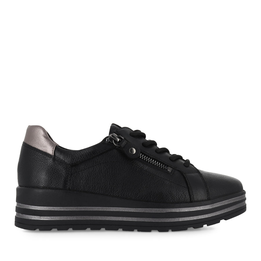 VAMRA XF by ZIERA is a stylish and supportive women's leather platform sneaker, perfect for everyday wear. Designed with a lace-up front and a convenient side zip, VAMRA XF offers a secure fit and effortless on and off wear. The slightly wedged platform sole is accented with silver stripes, adding a touch of shine and versatility.