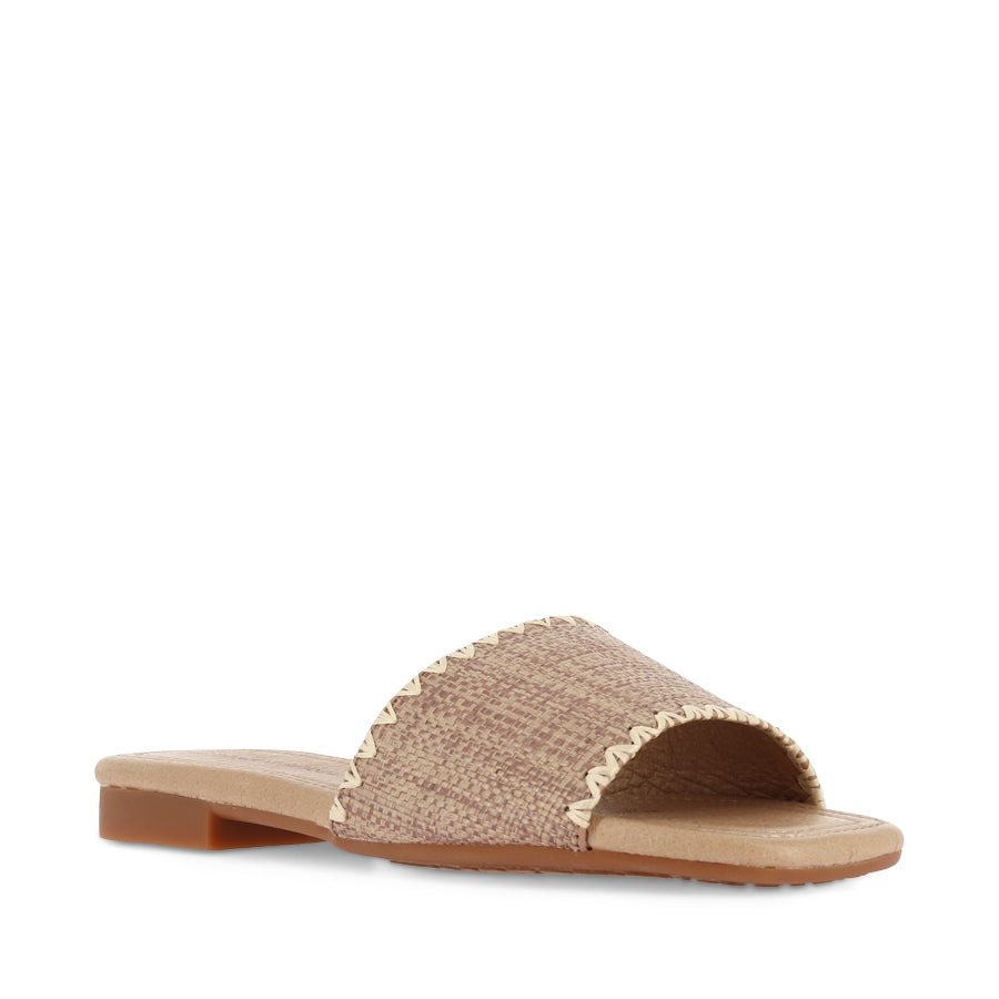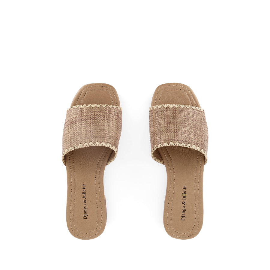 GAMPING by DJANGO & JULIETTE a women's slide embracing a minimalist approach to everyday style. A single raffia inspired strap, accented with triangular stitching along both seams, creates a handcrafted touch. This sleek slip on design showcases an open square toe and a low profile heel, adding subtle elevation and modern edge to any look.