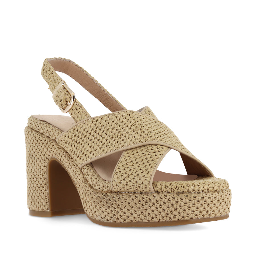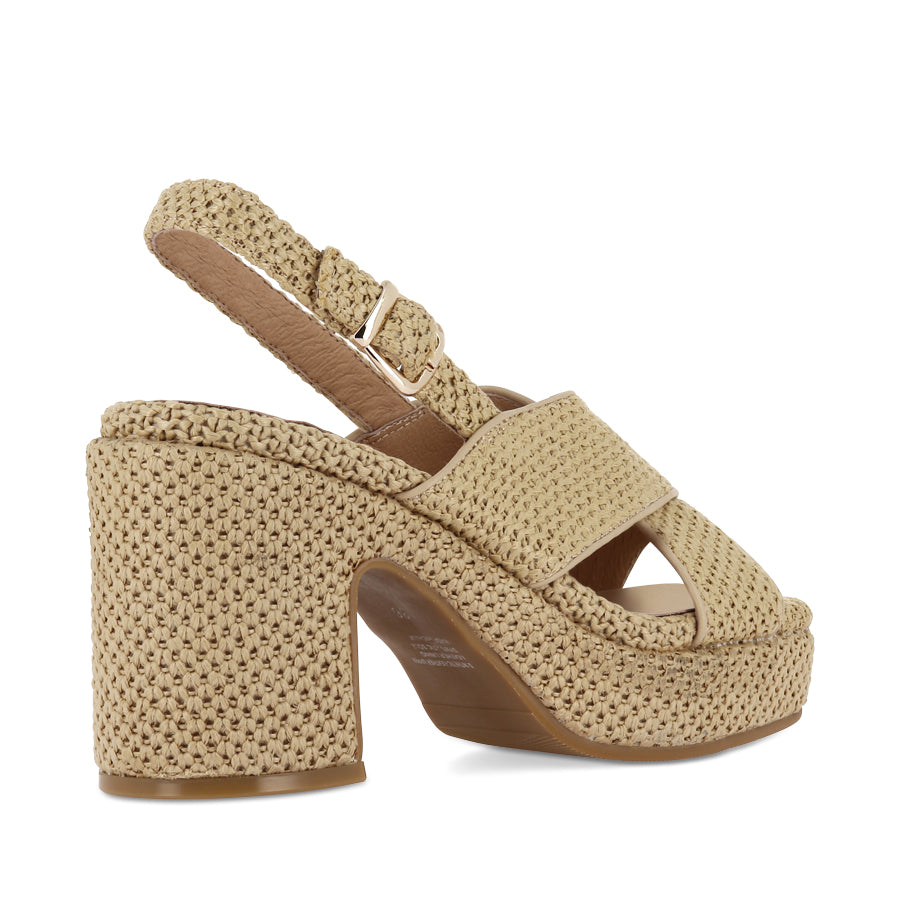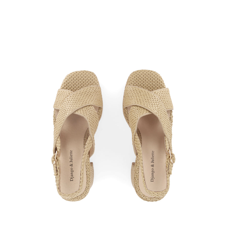 KIPPERS by DJANGO & JULIETTE is a women's platform heel with raffia detailing, perfect for warm weather styling. Dual thick raffia straps cross the toes, complemented by a slingback ankle strap with a buckle fastening for a secure fit. The platform and block heel are wrapped in raffia, adding texture and a natural finish to this standout summer design.