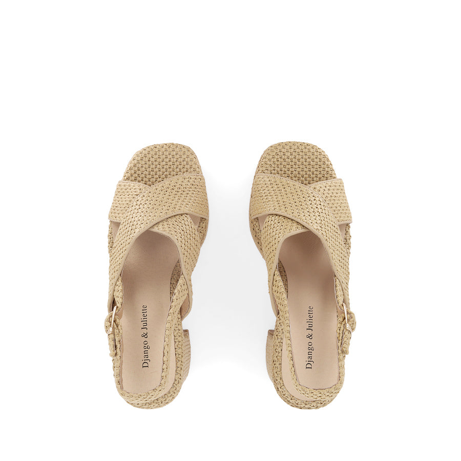KIPPERS by DJANGO & JULIETTE is a women's platform heel adorned with raffia, perfect for effortless warm weather styling. Dual thick raffia straps cross the foot, complemented by a slingback ankle strap with a buckle fastening for a secure fit. The platform and block heel are also covered in raffia, adding texture, height, and standout summer style.
