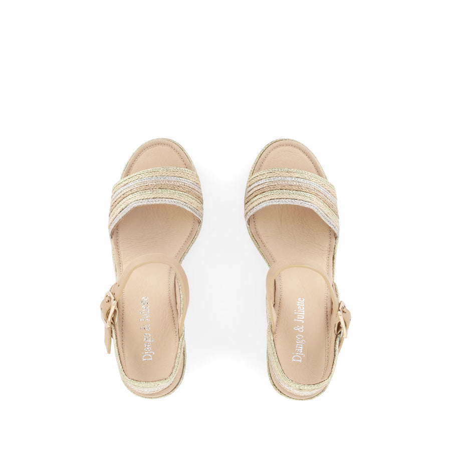 PELEZET by DJANGO & JULIETTE  a women's platform wedge that exudes effortless summer style. Featuring a vibrant multi toned braid stack that wraps around shoes exterior, highlighting an open round toe and a wide front strap for secure forefoot support. An adjustable ankle strap with gold buckle enhances comfort and fit, while the woven wedge heel adds subtle height making PELEZET the perfect wedge for a breezy, casual look that easily transitions from day to night.