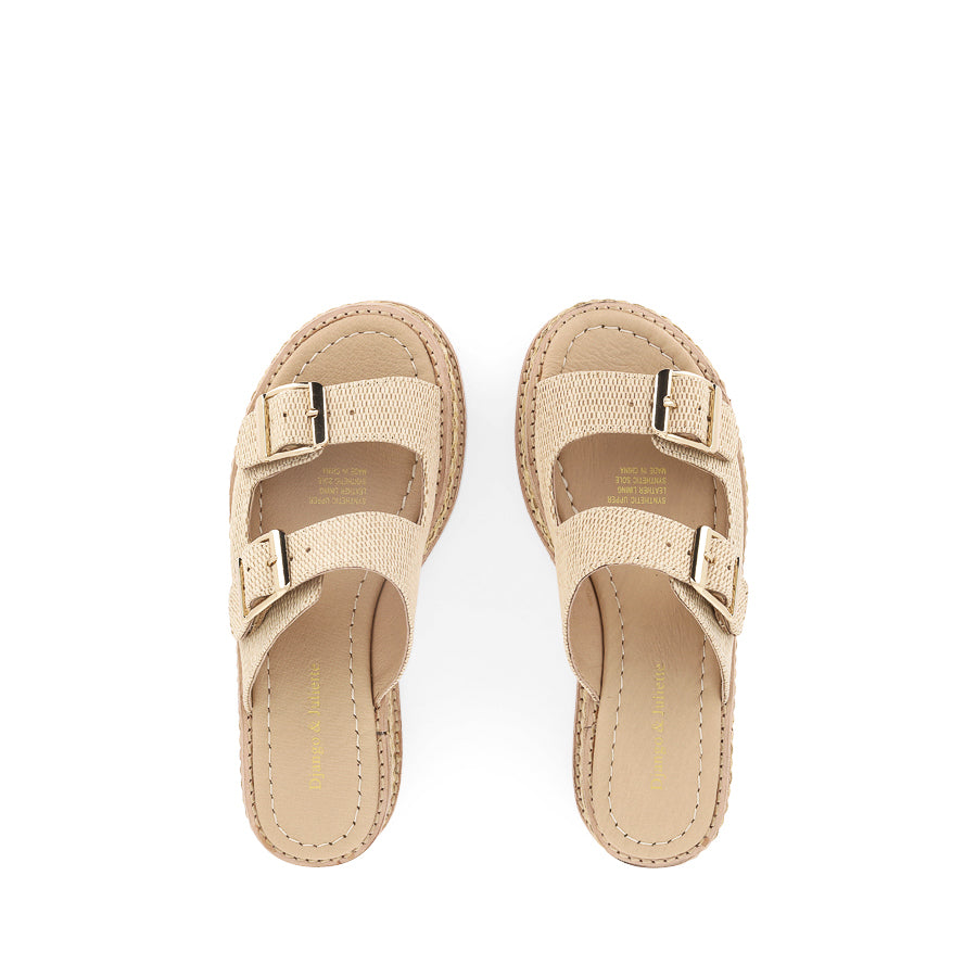 VIOLAS by DJANGO & JULIETTE elevates your warm-weather wardrobe. This chic platform slide features a double strap design with gold buckles and a natural raffia texture for a summery vibe. The platform sole offers both height and stability, making VIOLAS perfectly versatile - transitioning effortlessly from laid back outings to more elevated occasions.