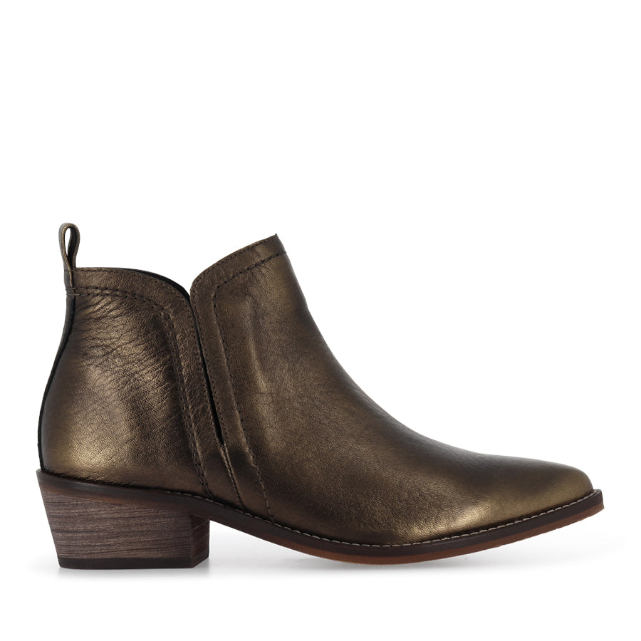 ZENN by EOS is a women’s low cut ankle boot featuring refined styling with a subtle western edge. Designed with concealed dual gussets, this style offers a clean, uninterrupted upper while allowing for easy on-and-off wear and a flexible fit. Inside, a soft combination of leather and fabric lining provides breathable comfort, while the tapered Cuban inspired block heel adds a confident lift with a rugged finish. A textured two tone resin outsole with decorative stitching enhances durability and completes the look with distinctive detail, making ZENN a versatile option for both everyday and elevated wear.