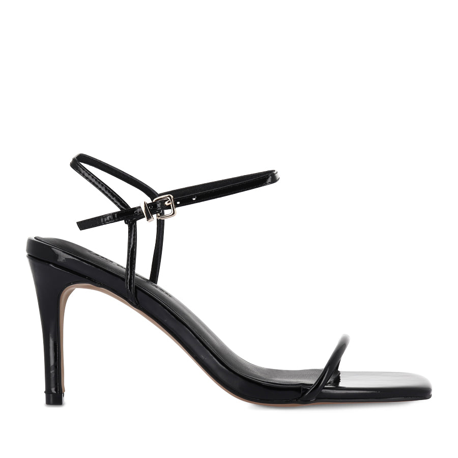VICKI by LANA WILKINSON is a high heel that embodies refined minimalism. Crafted in timeless black patent leather, this style features a slim strap across the toes and a delicate ankle straps secured with a buckle fastening. Finished with a stiletto heel and an open square toe, VICKI delivers a classic yet effortlessly chic finish to any look.