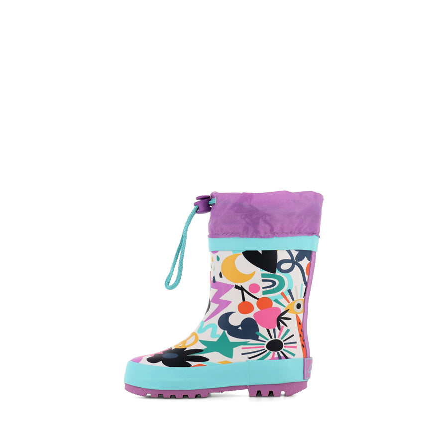 PUDDLES by CLARKS is a fun and functional kids' gumboot built for outdoor adventures. Designed with a water-resistant upper and breathable cotton lining, this boot keeps little feet dry and comfortable. The adjustable toggle offers an easy slip-on design and a secure fit, while the durable rubber outsole provides traction.