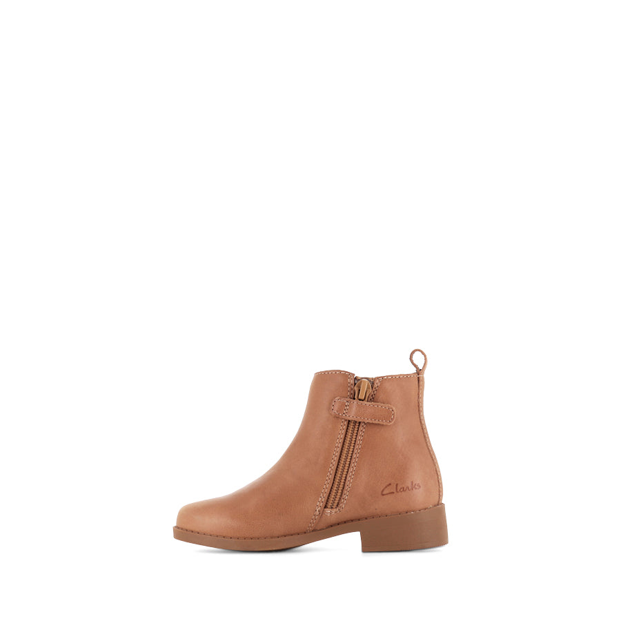 TARA by CLARKS is a kids ankle boot featuring star overlays, a soft EVA footbed, an elastic gusset, an inner zip, a round toe shape, a back pull tab and a dual fit, with a removable insole for a wider fit.