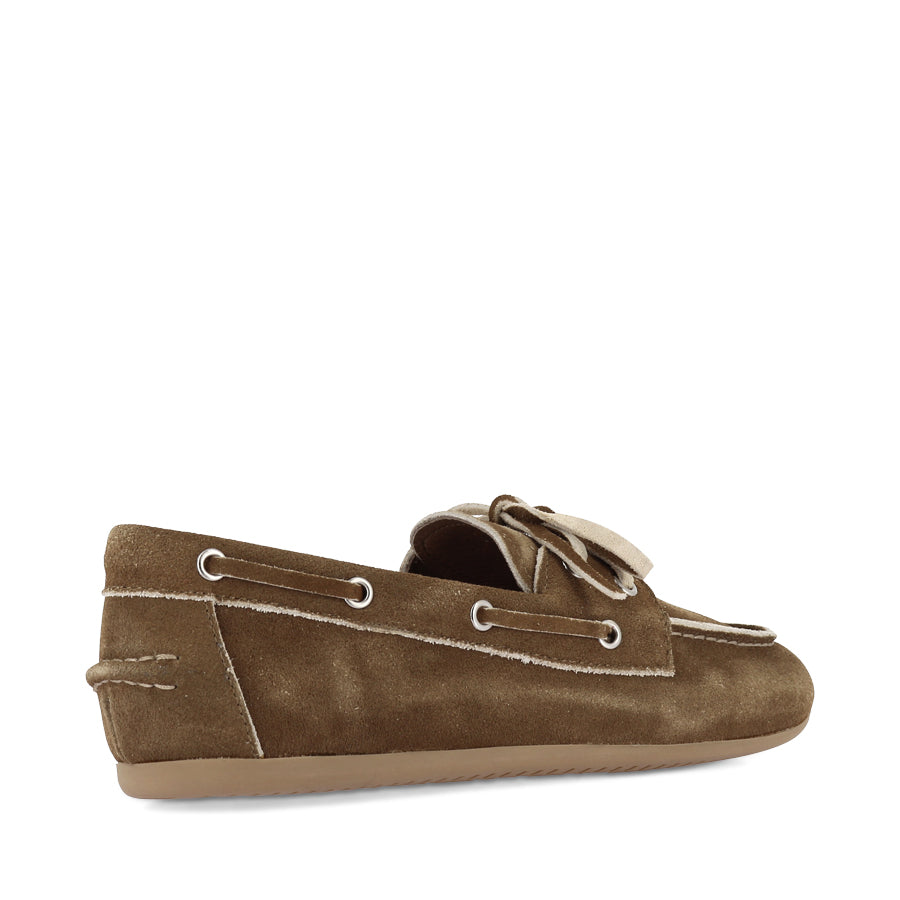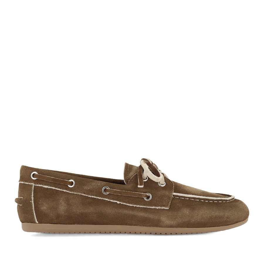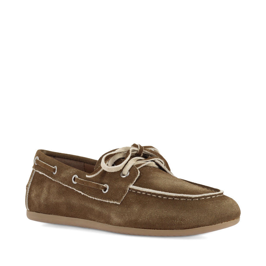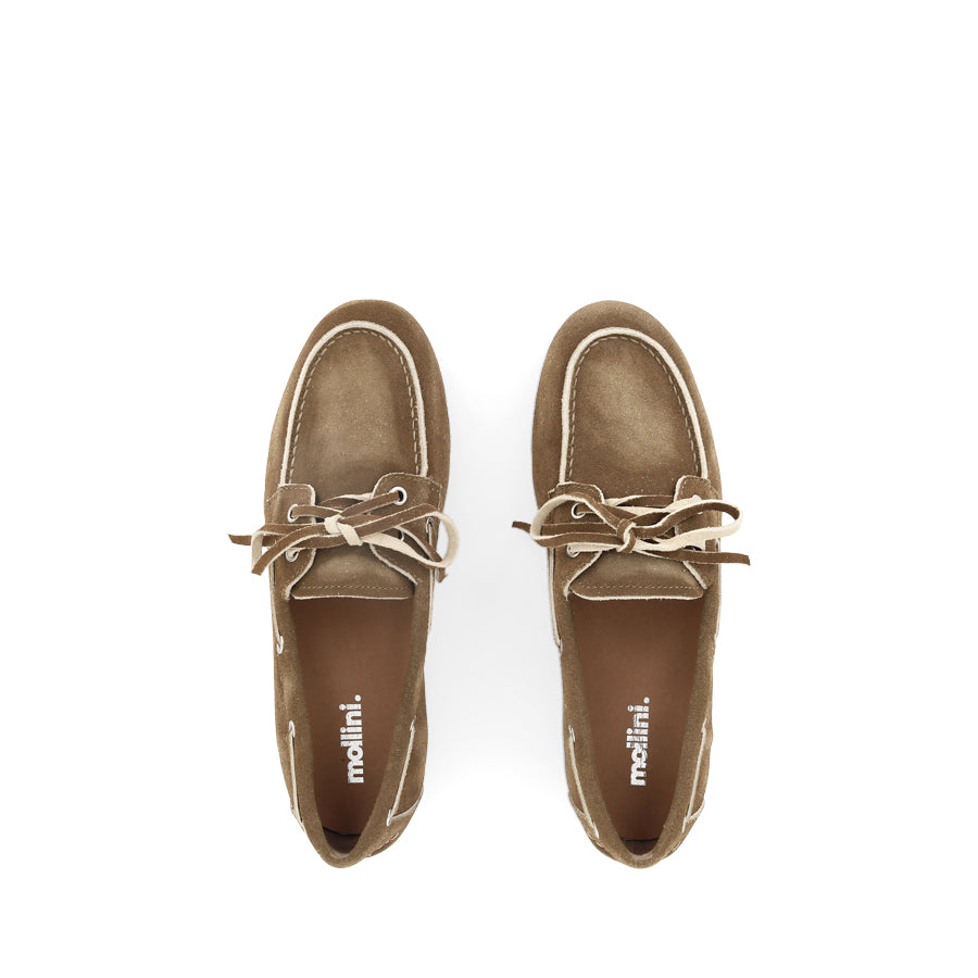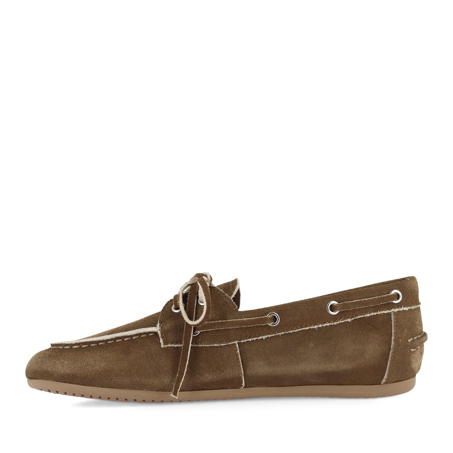 JERAE by MOLLINI reimagines the casual boat shoe combining preppy style with contemporary appeal. The rich mocha suede upper is paired with contrasting laces and trim delivering a standout detail. A rounded toe and easy slip on design keep the look effortlessly wearable. On trend and effortlessly chic, this design delivers a polished, versatile look that elevates everyday outfits while keeping comfort and wearability front of mind.