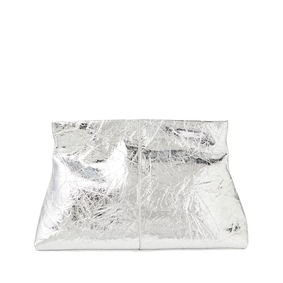 AEVIE by MOLLINI is a clutch style handbag crafted with a leather outer and fabric lining. The semi-structured design opens by gently pulling apart the sides at the opening. Inside, a spacious central compartment is complemented by an internal zip pocket and an open slip pocket, offering practical storage with a stylish finish.