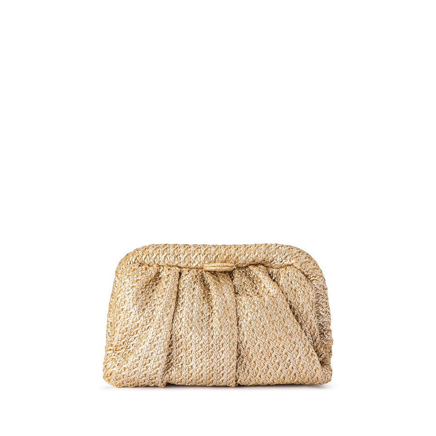 STEVIE PLEATED WOVEN CLUTCH by OLGA BERG offers timeless elegance with a modern twist. The pleated golden weave delivers eye-catching texture in a versatile design that transitions effortlessly from day to night. Finished with a removable shoulder chain for multiple styling options, this clutch is a polished go-to.