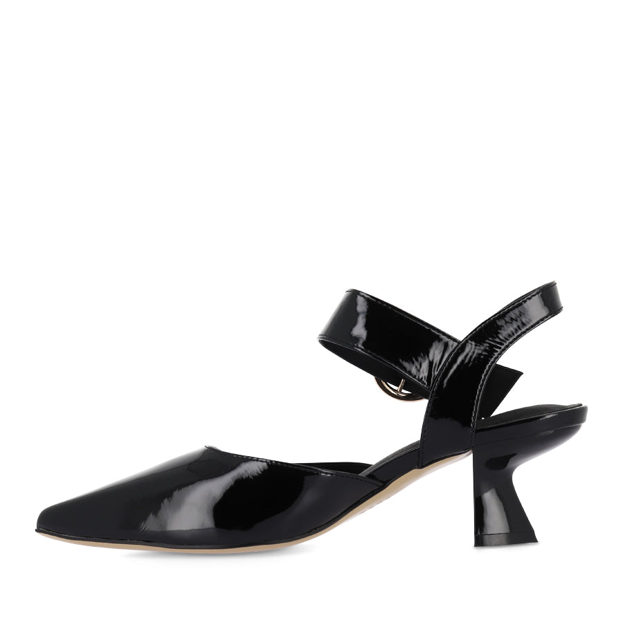 LIDES by DJANGO & JULIETTE is a refined women's heel designed to elevate any look. Crafted from glossy patent leather, this style features a sleek pointed toe, a sculptural triangular heel, and a bold buckle detail, delivering a polished, modern finish.
