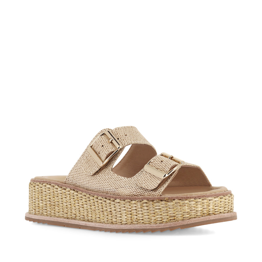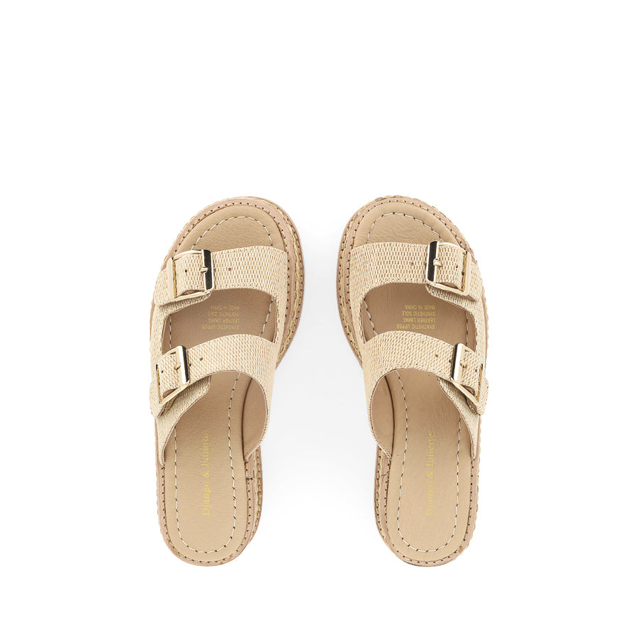 VIOLAS by DJANGO & JULIETTE is here to elevate your summer wardrobe. This chic platform slide features a double trap design with statement gold buckles and a natural raffia texture for a summery vibe. The platform sole offers both height and stability. Perfectly versatile, VIOLAS transitions effortlessly from laid back outings to more elevated occasions.
