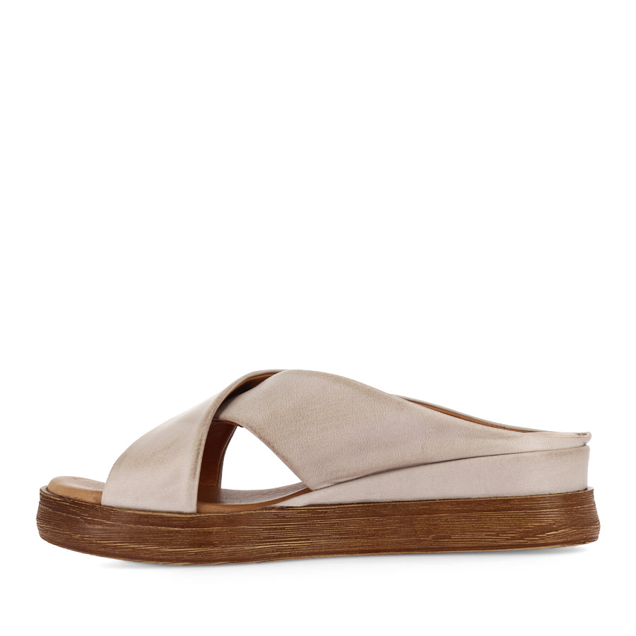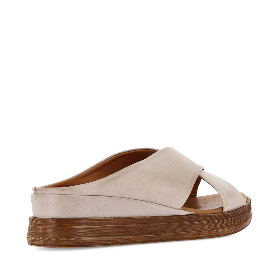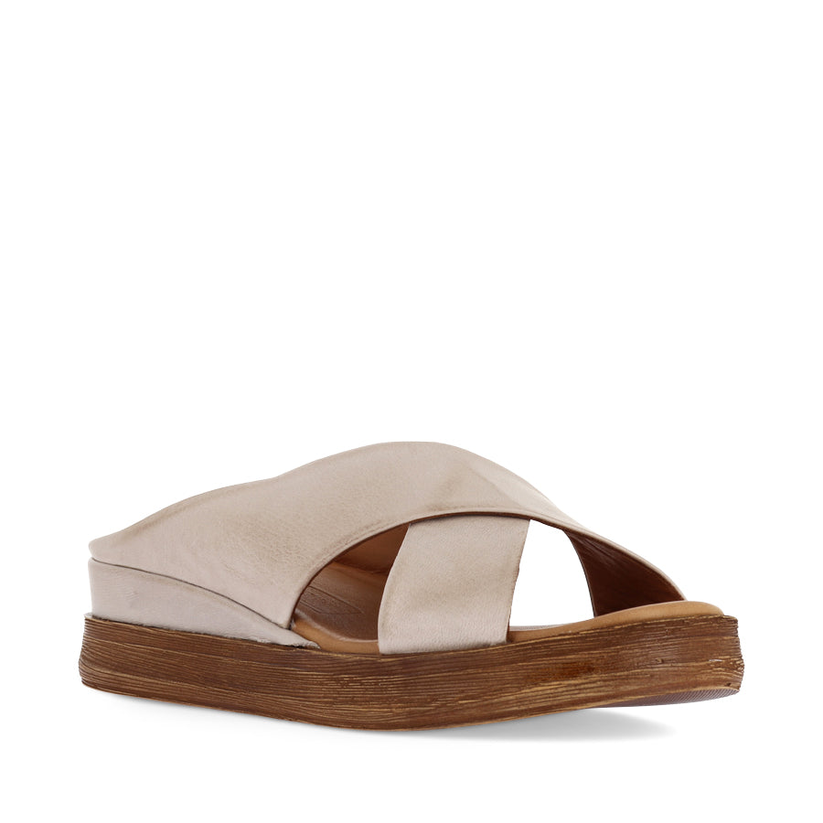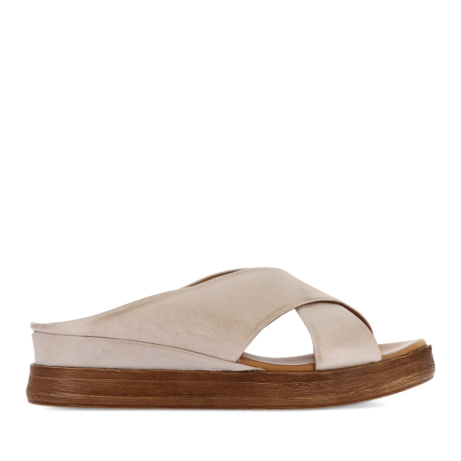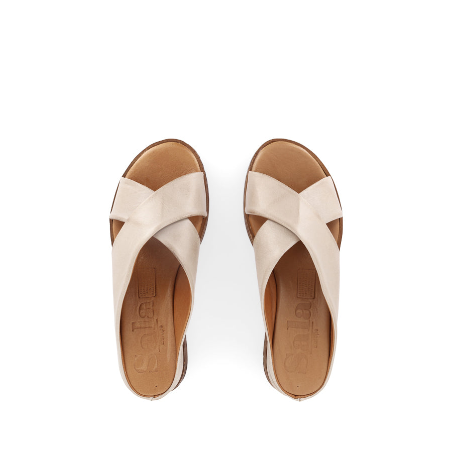 POSIE by SALA a women's crossover slide offering both style and comfort. Featuring a soft leather upper and a leather covered footbed made from super comfortable. The subtly wedged heel paired with a wood like sole adds a touch of height and elevation in style. POSIE is a versatile slide that pairs easily with various summer looks for chic, comfortable wear.