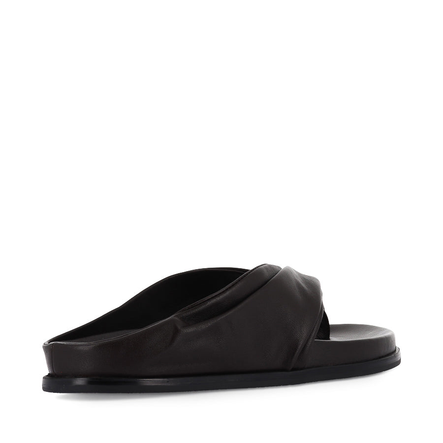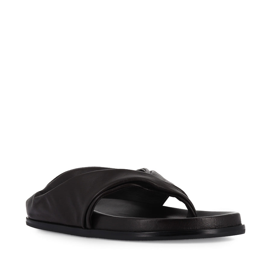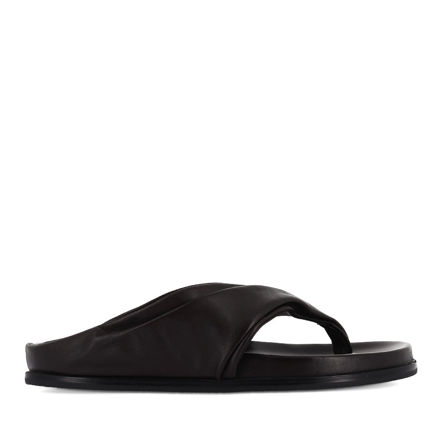 LAVINIA by TONY BIANCO is an elevated women's casual sandal that redefines everyday ease. Featuring broad gathered leather straps in a modern thong-style silhouette, an open round toe, and a lightly moulded footbed, this sculpted design offers contemporary edge and destined to become a go-to favourite.