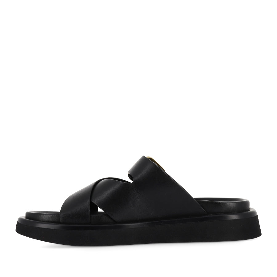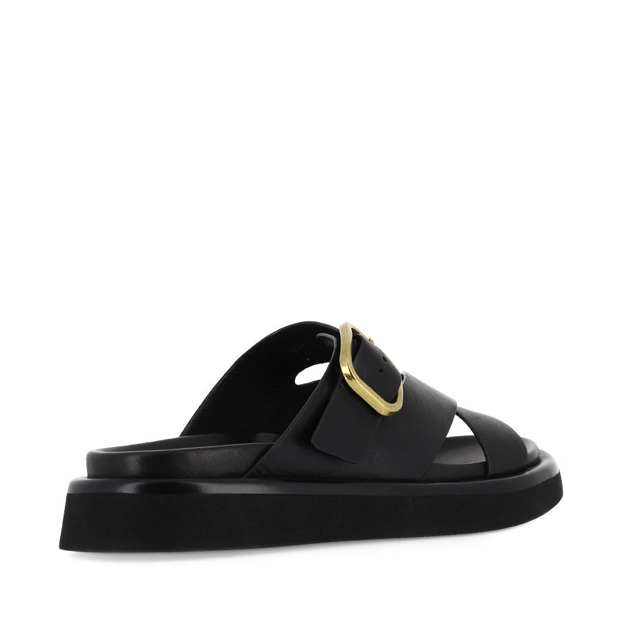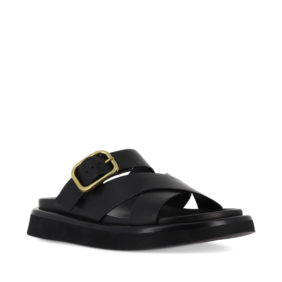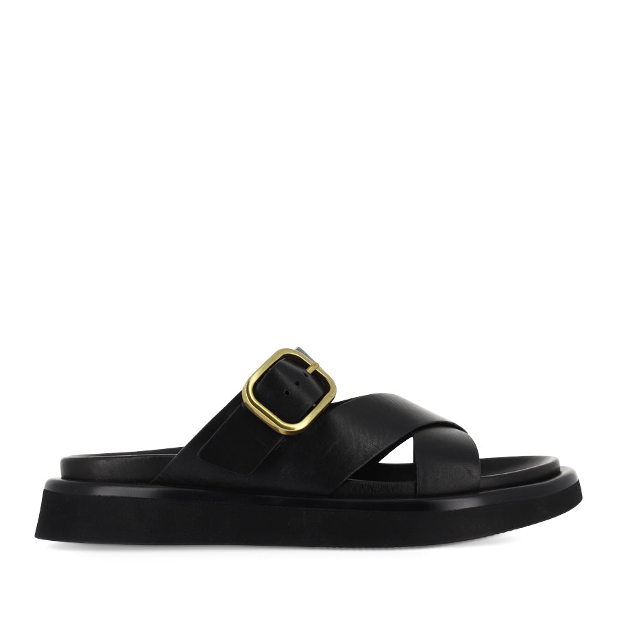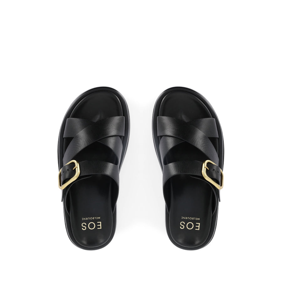 SLAY by EOS is a refined women's slide featuring crossover straps and an adjustable instep strap, accented by a soft brushed gold metal buckle for both style and practicality. A rounded toe and premium materials ensure a smooth, luxurious finish, making SLAY the perfect slide for a touch of effortless sophistication.