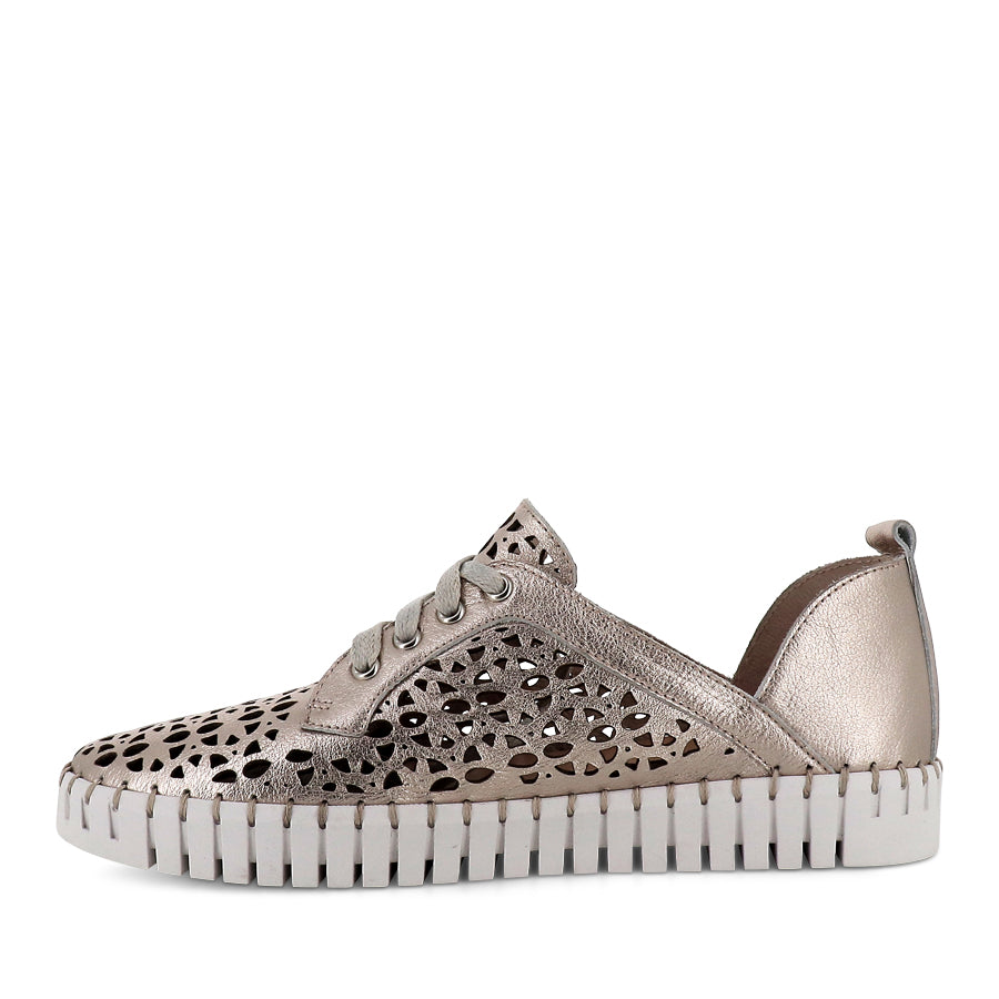 HAIFA by DJANGO & JULIETTE is a women's sneaker-style shoe with an intricate laser cut design, adjustable lace up closure, a cleated sole, a back pull tab and a round toe shape.