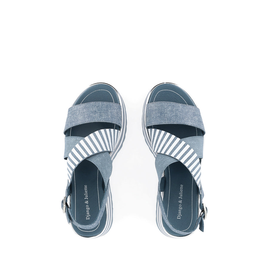 HUNTERS by DJANGO & JULIETTE a stylish women's platform sandal designed for effortless summer wear. A classic round open toe meets a bold criss cross strap across the foot, flowing seamlessly into an adjustable ankle strap with buckle fastening. A striking stripe pattern runs throughout the design, from the upper strap to the platform sole.  A subtle metallic band wraps the top of the sole, perfectly complementing the striped platform wedge for a polished, contemporary look.