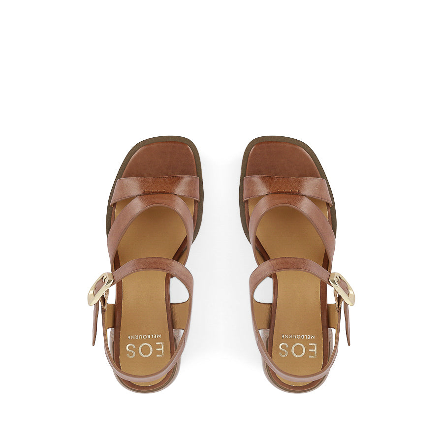ISOKEN by EOS is a women's heel crafted from premium leather, featuring a stacked block heel for stability and elegant height, crossover straps, and a Y-back ankle strap with a gold buckle fastening. An open square toe adds a contemporary finish, making ISOKEN a versatile choice for both everyday wear and special occasions.