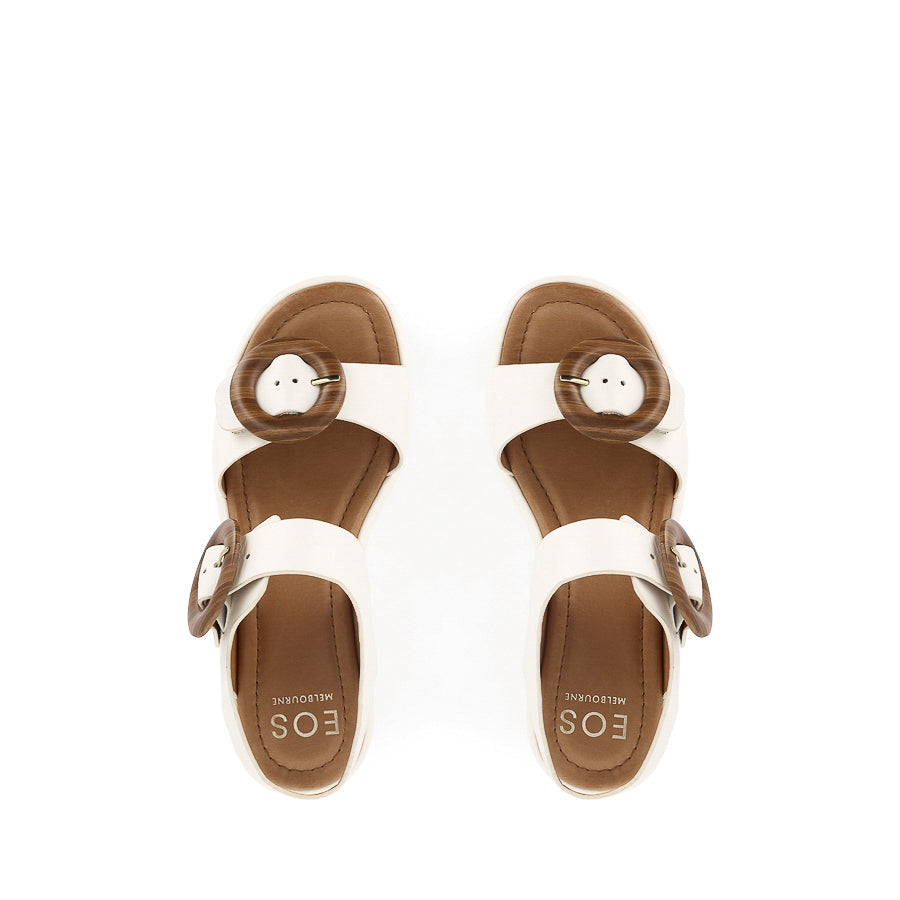 MENORCAS by EOS a stylish women's wedge sandal for effortless summer wear. A classic round open toe stacked on a platform wedge sole pairs with bold straps and slingback for structure and support. Dual adjustable straps fasten by statement round buckle on the outer side adds visual interest. perfectly complemented by a subtle wedged platform heel offering a gentle lift and elevation of style.