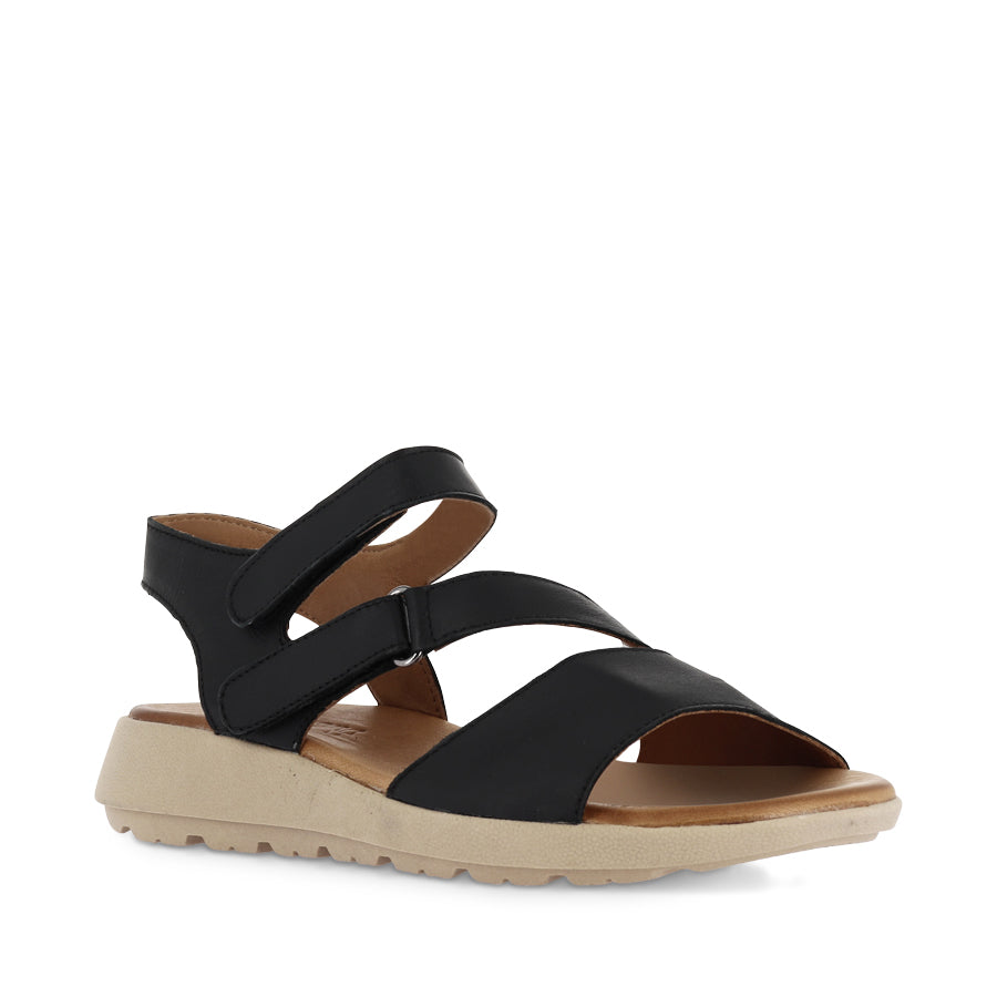 POPPY by RILASSARE a casual women's sandal designed for everyday summer wear. Interwoven leather straps with two adjustable hook and loop fastenings at the instep and heel provide a secure and customizable fit, while a rounded toe ensures comfortable wear. A gently wedged sole adds subtle lift, making POPPY an easygoing, versatile choice for warm weather styling.