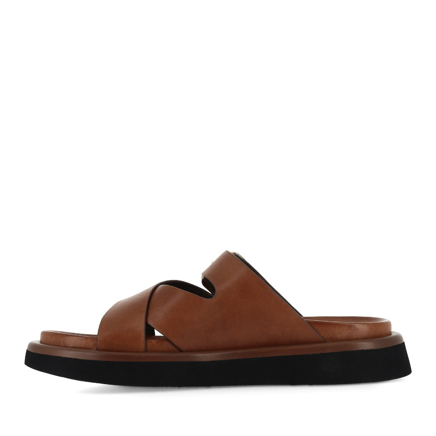 SLAY by EOS is a refined women's slide featuring crossover straps and an adjustable instep strap, accented by a soft brushed gold metal buckle for both style and practicality. A rounded toe and premium materials ensure a smooth, luxurious finish, making SLAY the perfect slide for a touch of effortless sophistication.