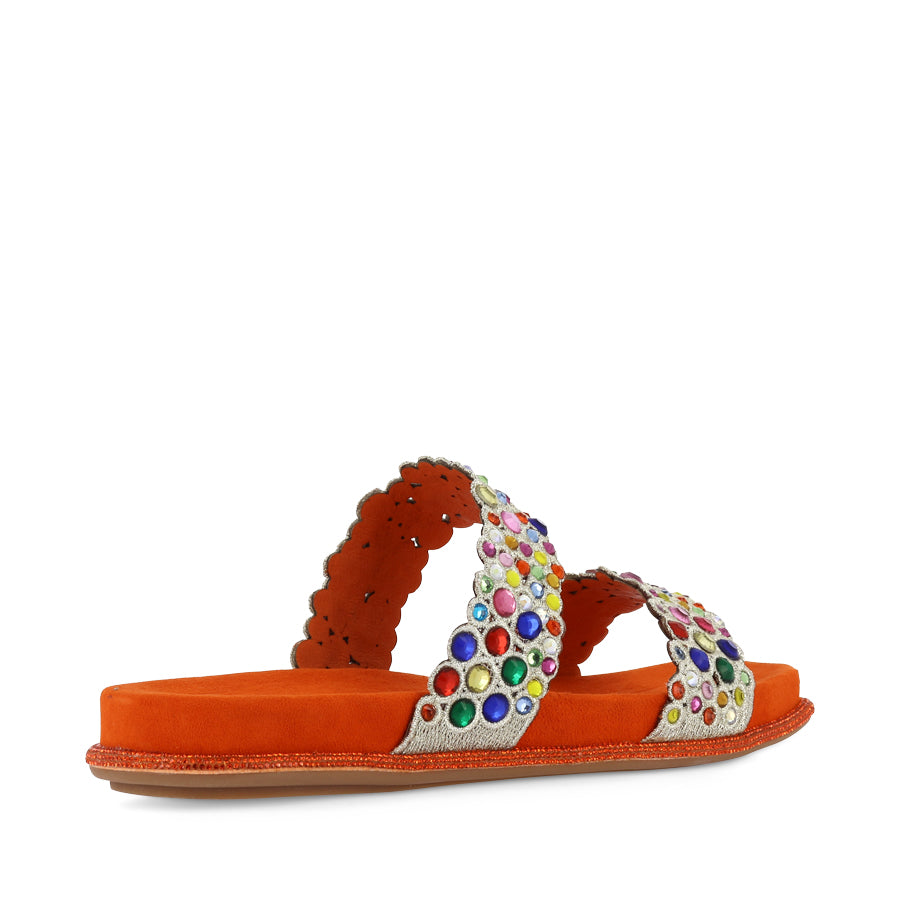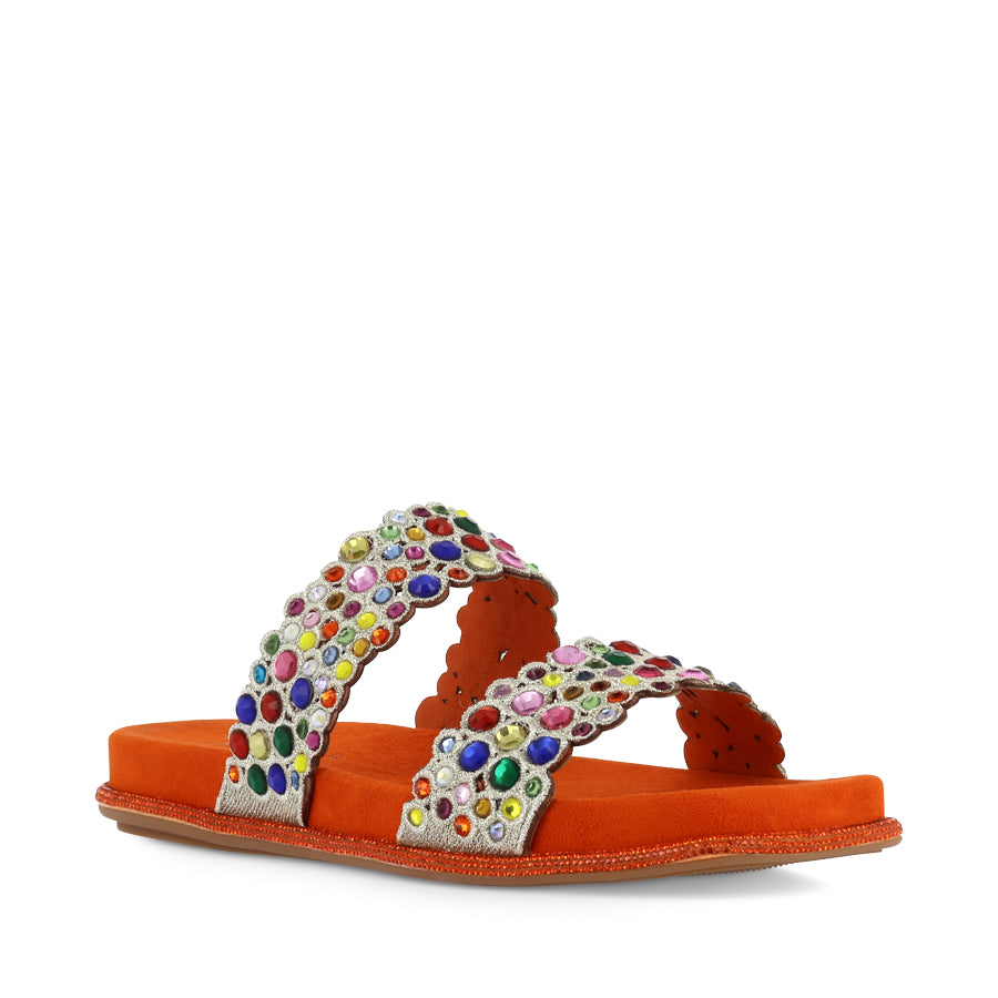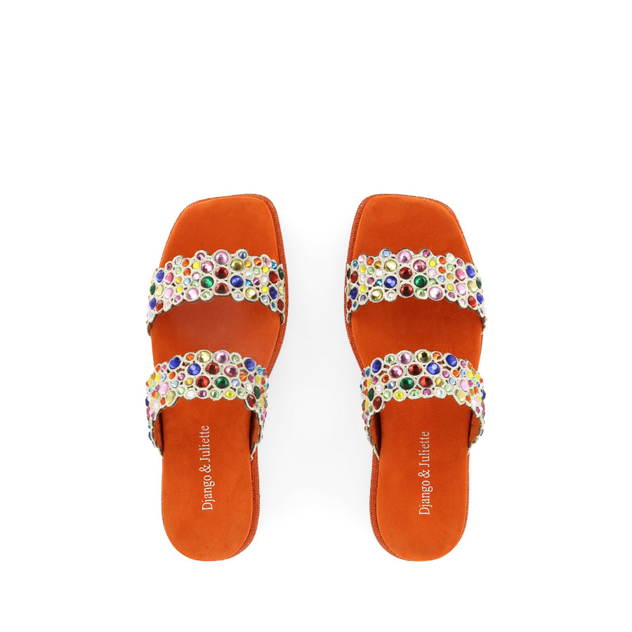 YERBA by DJANGO & JULIETTE delivers a show-stopping slide, defined by gold dual straps adorned with sparkling gems. The lightweight sole features a square toe and a shimmering diamante trim, adding a striking finish that adds instant glamour to summer ensembles.