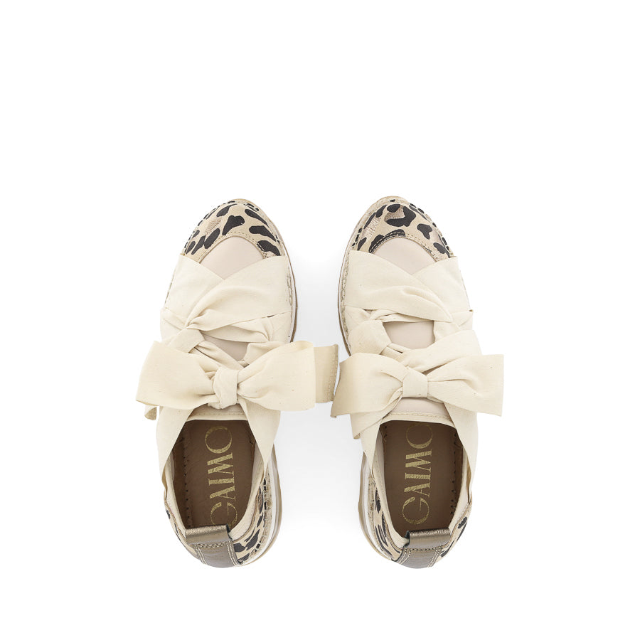 VENUS LEO by GAIMO is a women's sock-style sneaker featuring a bold oversized bow for a playful, statement-making look. Crafted with stretch Lycra and contrasting leather, this sneaker sits on a layered platform sole combining rubber and eco-friendly jute, and includes leather lined, padded insoles, plus a convenient back pull tab. Designed and handcrafted in Spain, VENUS LEO blends feminine flair with modern sporty style for eye-catching outfits.