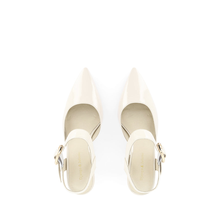 LIDES by DJANGO & JULIETTE is a refined women's heel designed to elevate any look. Crafted from glossy patent leather, this style features a sleek pointed toe, a sculptural triangular heel, and a bold buckle detail, delivering a polished, modern finish.